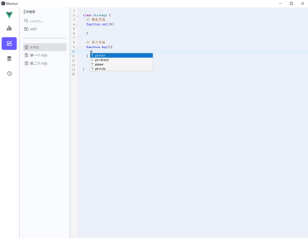 策略编写模块主要用编写策略,在该模块中提供一个代码编辑器,可以用写 javaScript 的方式让用户编写自己的策略。顺带可以对编写好的策略进行修改,删除,等操作。策略编写模块界面图所示。