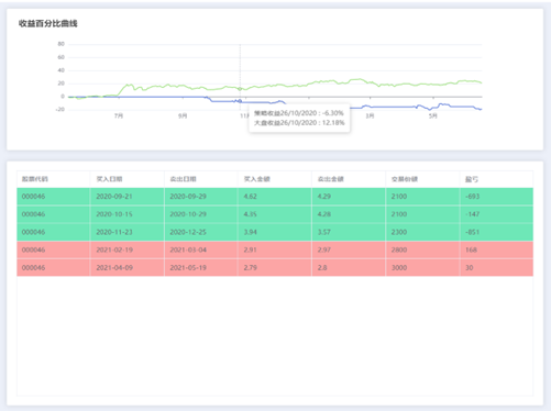 回测历史分析。回测历史分析模块中可以对策略每次交易的买入卖出进行分析,可以观察策略的收益和大盘平均收益的差距。效果图如图所示。