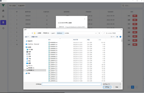 **数据来源管理。**用户可以从外部文件中导入相应的的数据用于支持后面的回测工作。其界面效果图所示。