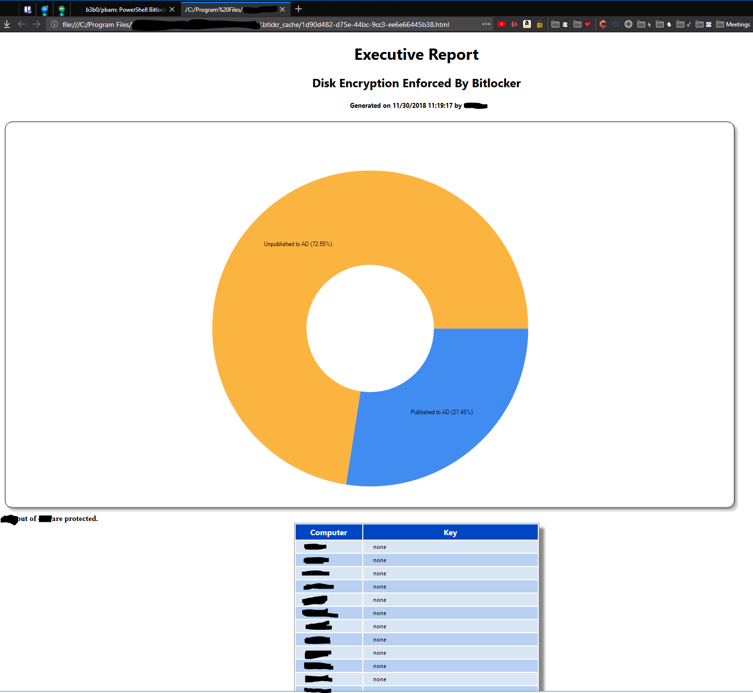 pbam PowerShell Bitlocker Administration & Monitoring - a little tool to report on Bitlocker status. Requirements Windows environment (obvious) Remote Server Administration Tools Python 2.7 / pip in your $PATH pip install pdfkit framework Installation Have all of your requirements fulfilled. Download the .zip Unzip the .zip Cd into unzipped folder Run SetupPBAM.exe as administrator Run C:\Program Files\PBAM\pbam.exe Now You're Bitlockin' With Power™ The future Ability to push Bitlocker keys to AD if they exist on a target machine More charting options More as I think about it