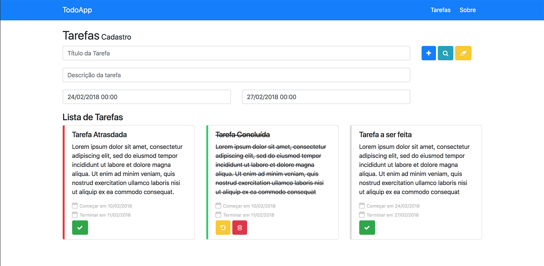TodoApp faz uso de uma api em NodeJS e MongoDB, é possível adicionar nova tarefa, marcar como concluída, excluir, buscar pelo título, borda lateral das tarefas indica se ela está para fazer, atrasada ou concluída.