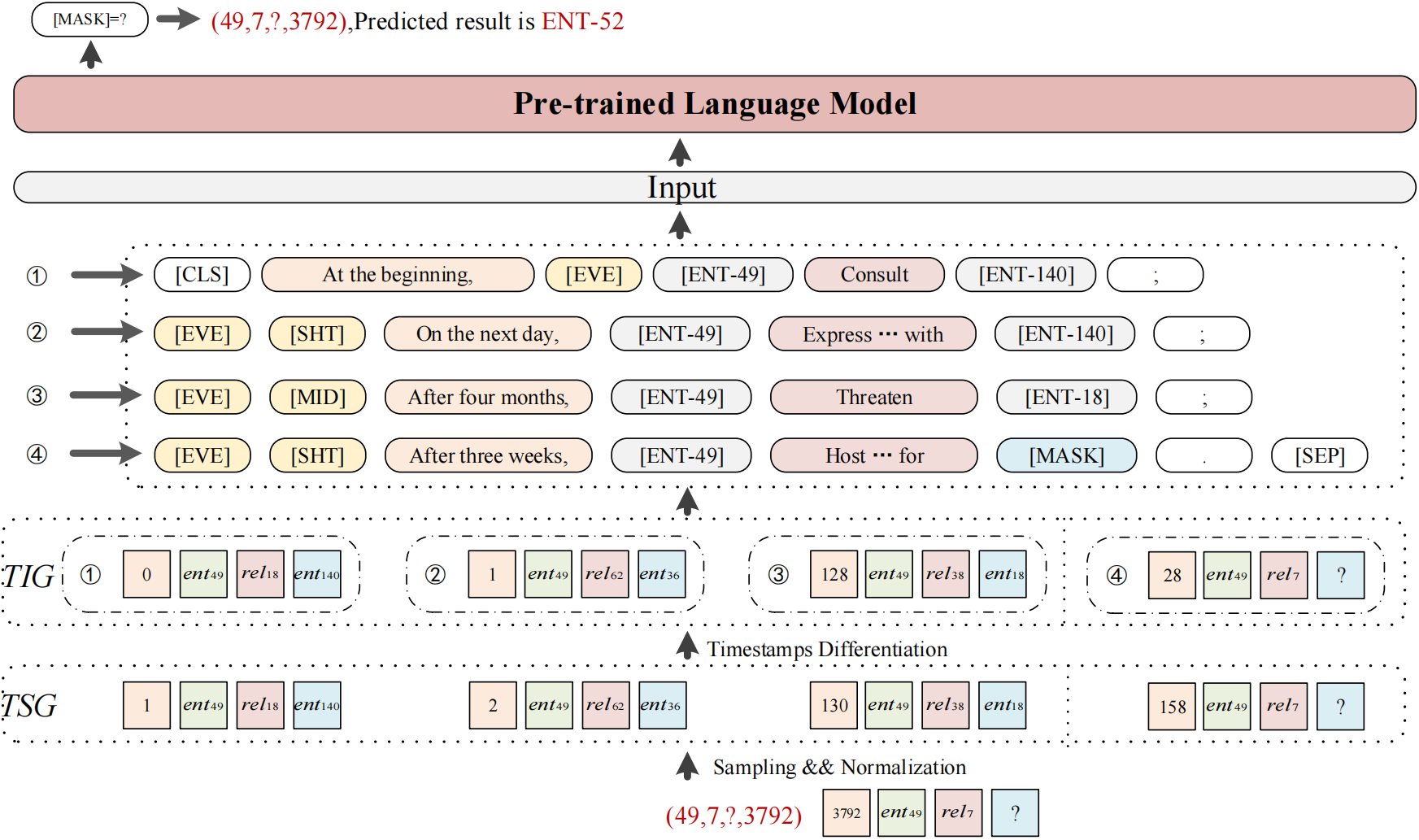 Temporal Knowledge graph completion (TKGC) is a crucial task that involves reasoning at known timestamps to complete the missing part of facts and has attracted more and more attention in recent years. Most existing methods focus on learning representations based on graph neural networks while inaccurately extracting information from timestamps and insufficiently utilizing the implied information in relations. To address these problems, we propose a novel TKGC model, namely Pre-trained Language Model with Prompts for TKGC (PPT). We convert a series of sampled quadruples into pre-trained language model inputs and convert intervals between timestamps into different prompts to make coherent sentences with implicit semantic information. We train our model with a masking strategy to convert TKGC task into a masked token prediction task, which can leverage the semantic information in pre-trained language models. Experiments on three benchmark datasets and extensive analysis demonstrate that our model has great competitiveness compared to other models with four metrics. Our model can effectively incorporate information from temporal knowledge graphs into the language models.