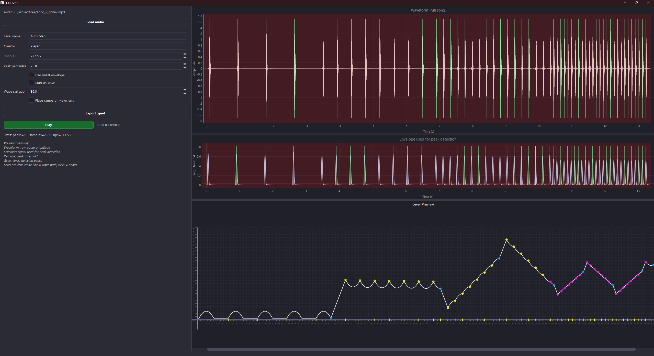 .gmdformat used by the GDShare mod to write valid level files importable directly into GD - PyQt GUI with synchronized audio waveform and level geometry preview