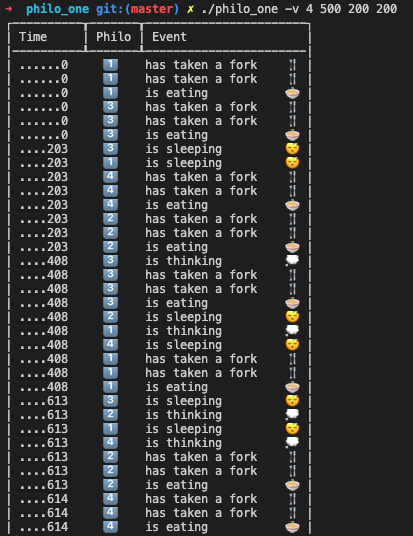 I made a visual option, which makes it possible to have a prettier display, which reduces performance a little. To use it, add the option -v after the executable, this option is only available on philo_zero (philo zero is identical to philo one, but it can handle the [-v] option)