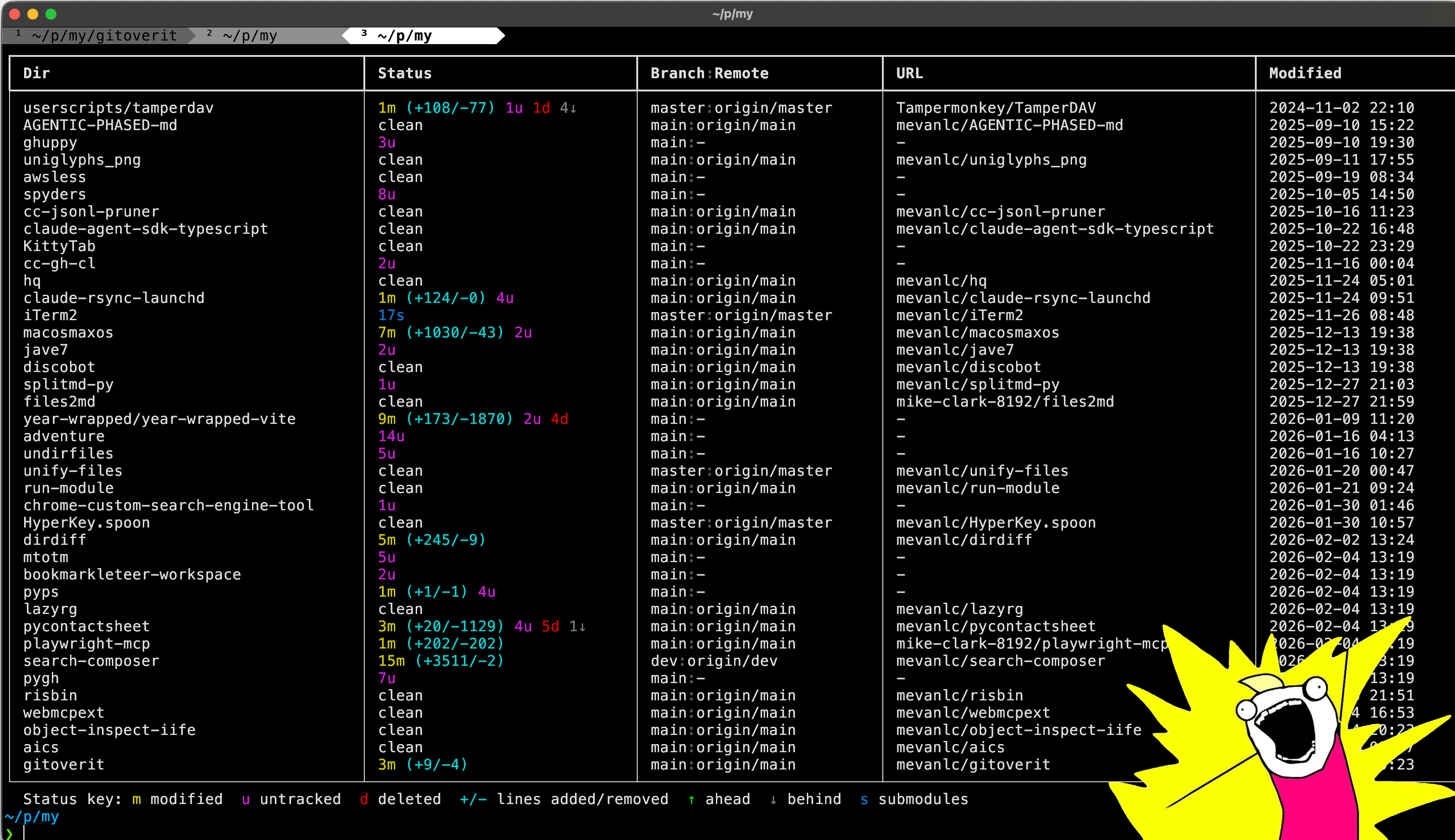 gitoverit ~/projects -c -,dir,status# Scan the current directory