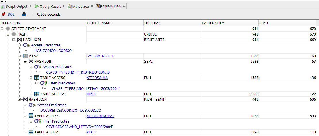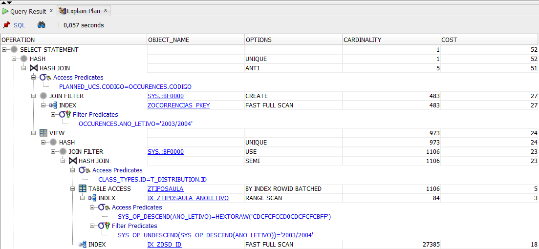 CREATE INDEX IX_ZUCS_CODIGO_CURSO ON ZUCS(codigo, curso);The first one is useful since the tipo column from ZTIPOSAULA is used in the HAVING clause to determine if a course has all types of classes. This makes the HAVING statement have a cost of 13 instead of 37. In spite of this, the total cost of the query won't change with this index.