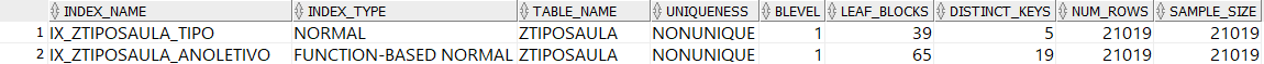 SELECT index_name, index_type, table_name, uniqueness, blevel, leaf_blocks, distinct_keys, num_rows