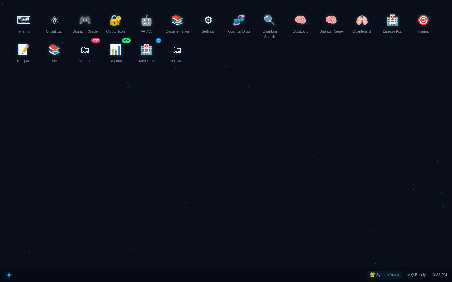 QubitPage® OS — browser-based quantum desktop with 20 app icons, IBM Quantum integration, MedGemma AI diagnosis, AI drug discovery, and a full QLang circuit lab